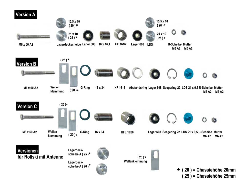 bei diesem Rollski sind alle Achsen und Lager aus rostfreiem Stahl